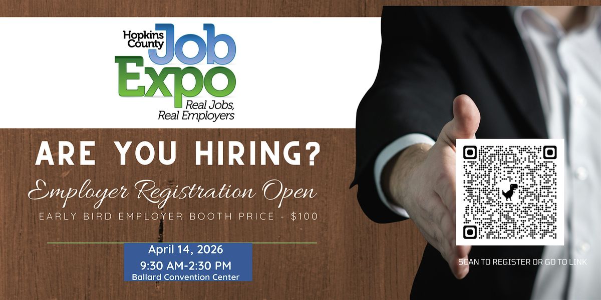 Registration is now open for the April 14, 2026 Hopkins County Job Expo, with room for 65 employers. This event will be held at the Ballard Convention Center in Madisonville, KY on Tuesday, April 14, 2026 from 9:30 AM to 2:30 PM.