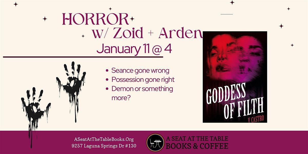 Join Zoid and Arden to discuss V. Castro's horror novel, Goddess of Filth! To join, buy your copy of the book from us, read it in advance or be alright with spoilers, and RSVP here on Eventbrite so we know to expect you!