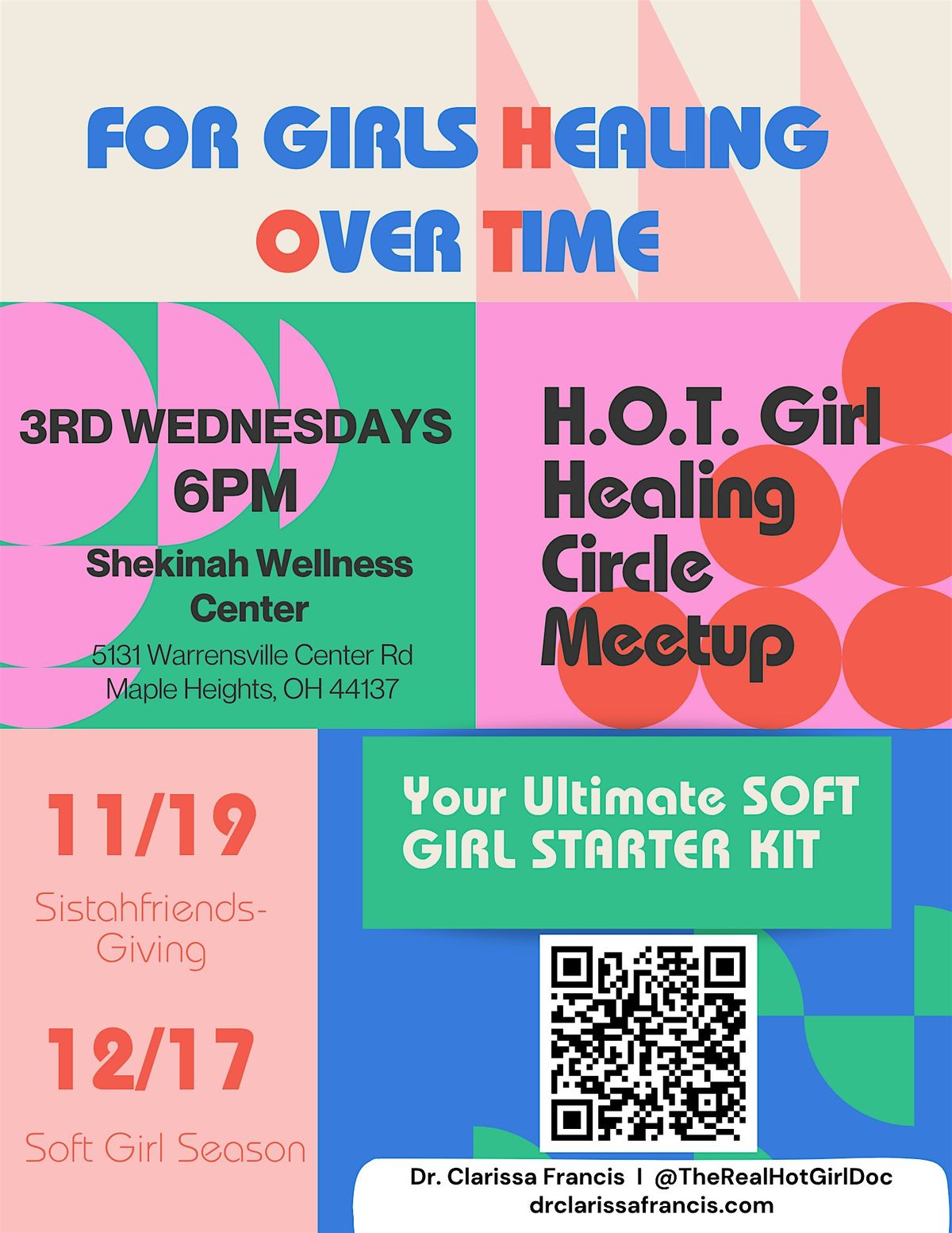 Welcome to the H.O.T. Girl Healing Series! Join us at the Shekinah Wellness Center for a transformative experience. This series is all about empowering and uplifting women. Get ready to connect with like-minded individuals, learn from inspiring speakers, and participate in healing activities. Don't miss out on this opportunity to prioritize your well-being and embrace your inner strength. Mark your calendars and get ready to experience a day filled with growth and positivity!