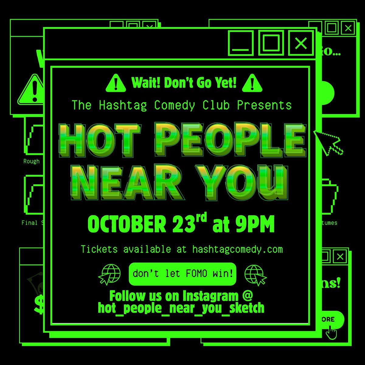 This is the show for you!"Hot People Near You" is presented by Hashtag Comedy Company and combines the talents of sketch/improv players from current and former comedy groups including: Monday Night Live, Actual Wolves, Backburner Comedy, Artificial Idiocy and more!