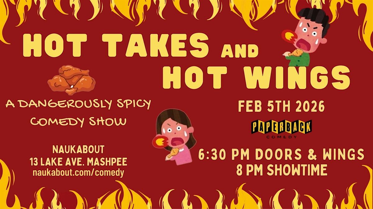 Come on out and join us for some spicy comedy on February 5th, at 7 pm at Naukabout Brewery in Mashpee! Hot Wings, Hot Takes is a comedy show powered by hot sauce and comedianβs tears. Comedians will take the stage while eating progressively spicier hot wings while fighting to deliver their sets.The hotter the wings get, the more you will laugh (with them or at them).