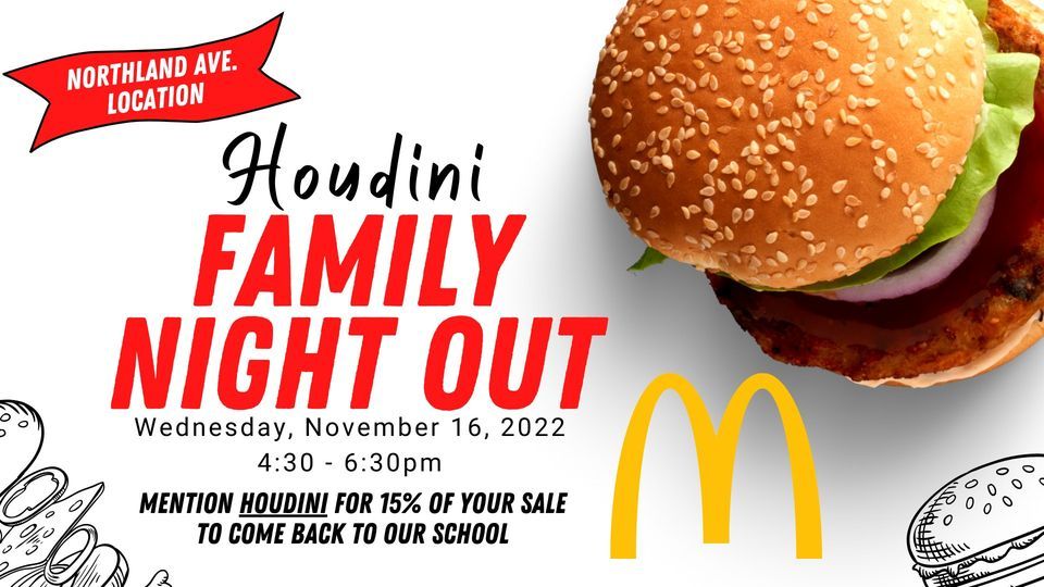 *Join us for a HOUDINI FAMILY NIGHT OUT at McDonald's (Northland/Richmond location) on Wednesday, November 16th!!*This event is valid 4:30-6:30pm!