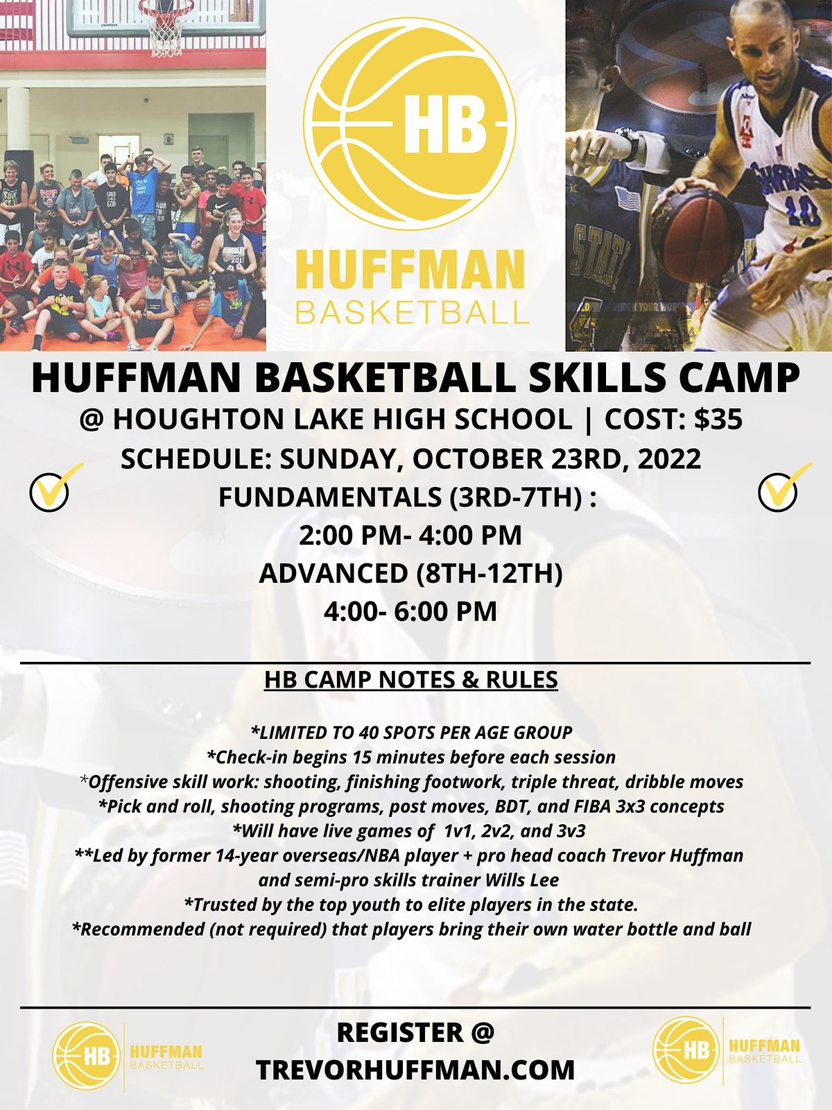 @HOUGHTON LAKE HIGH SCHOOL THURSDAY, OCTOBER 23RD, 2022FUNDAMENTALS 1ST SESSION (3RD-7TH GRADE BOYS/GIRLS): 2:00PM - 4:00PMADVANCED 2ND SESSION (8TH-12TH GRADE BOYS/GIRLS): 4:30PM-6:30PMCAMP NOTES:*Check-in begins 15 minutes before the session starts*Offensive Skill Training, Basketball Decision Training, Move Progressions, Triple threat concepts*Footwork progressions for shooting, moves, and more*Players are divided by skills, ages, and each session is capped at 40 kids *Highly recommended that players bring water bottle and their own basketball*HB trainers with 30 years of NCAA, European, and NBA playing experience