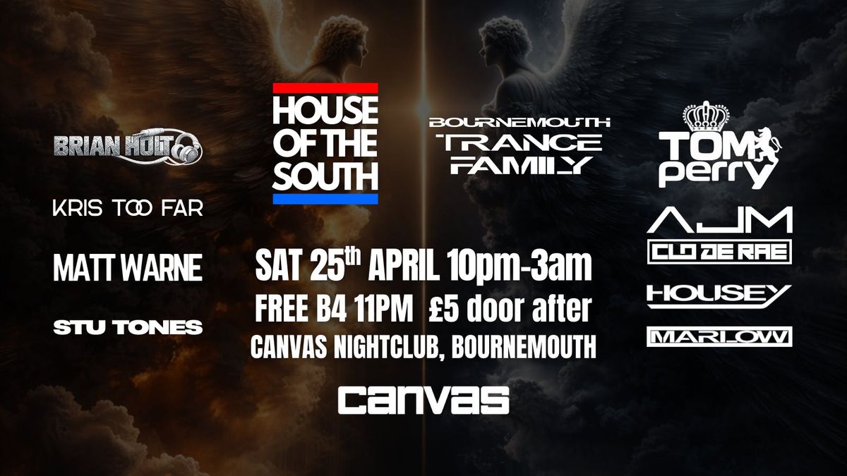 House of the South and Bournemouth Trance Family join forces for a very special night of house and trance music at Canvas!Bournemouth Trance Family host the trance room on the main stage and have three superb guests joining residents Marlow and Housey - local legend and Global Language host Tom Perry who is joined by the awesome trance duo AJM and Clo de Rae!