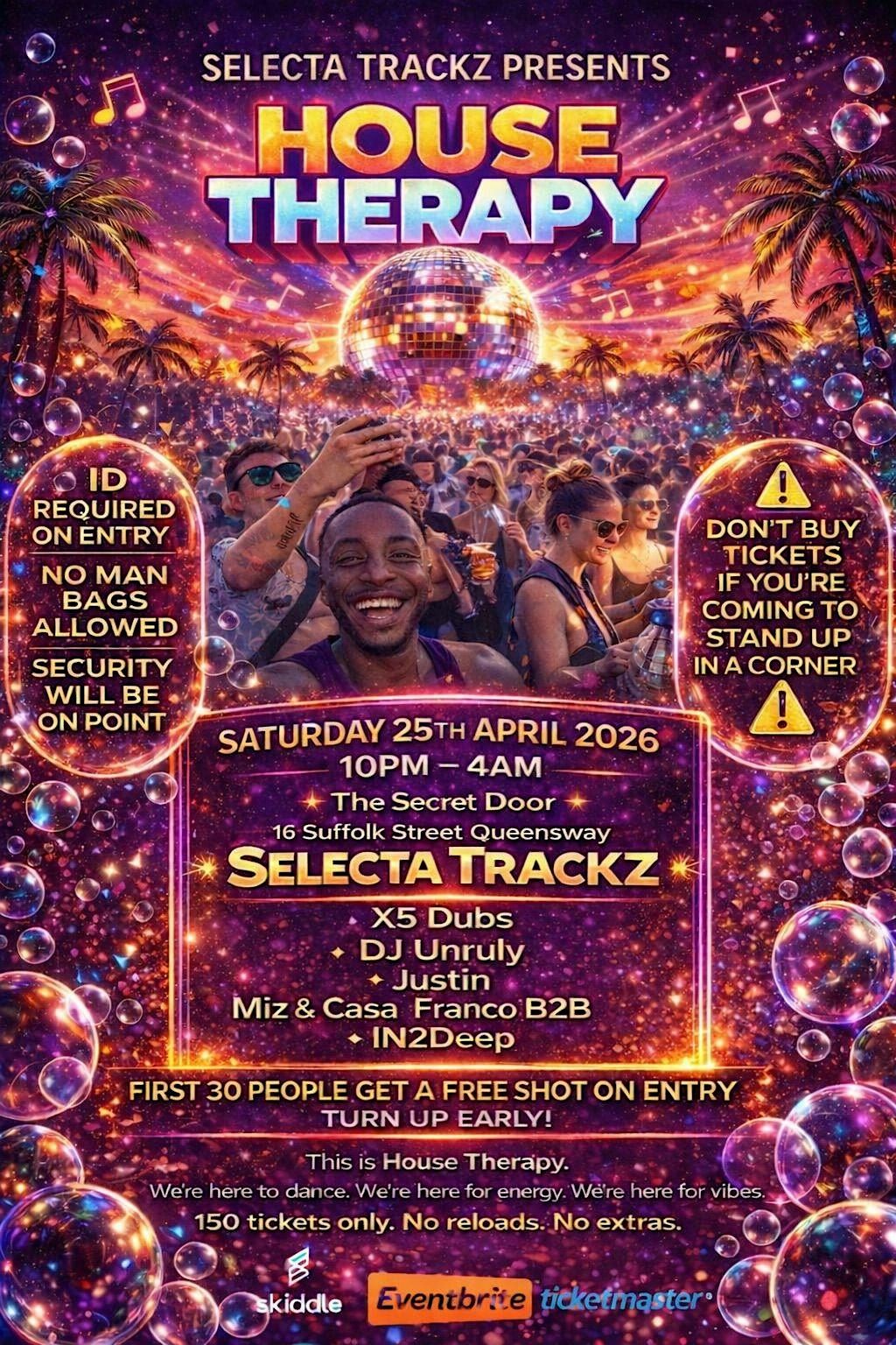 House Therapy isn’t just a rave — it’s a full reset for the soul. A night where deep basslines meet pure energy and the dancefloor becomes therapy. Curated by Selecta Trackz, this is where real house heads gather for one unforgettable journey.