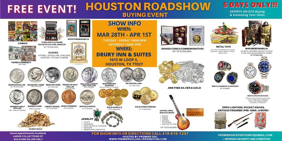 A FREE five-day only event for an on-site expert to evaluate your precious metals, coins, collectibles, and antiques!You're invited!! We are buying in HOUSTON, TX!