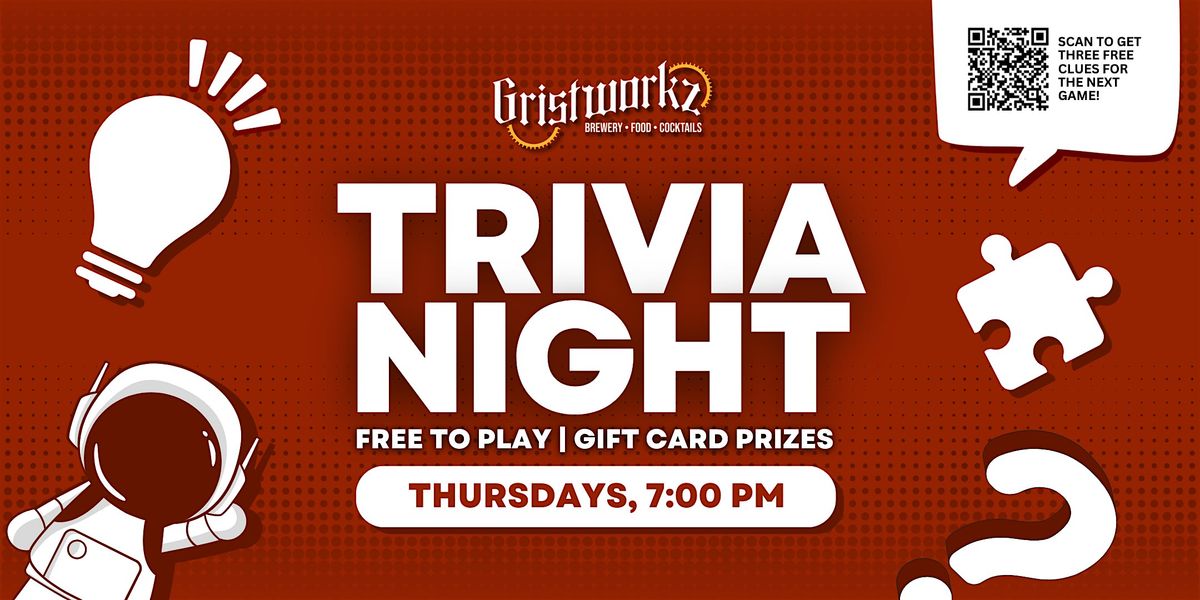 Join us for free live trivia every Thursday at 7pm at Gristworkz in Houston, TX! Free to play, and top teams win gift card prizes!