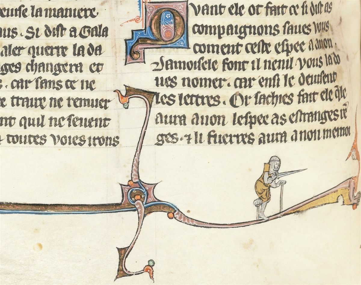Image Caption: Arthurian Romances manuscript illustration, 1290-1300. Digital image courtesy of Beinecke Rare Book and Manuscript Library, Yale University (MS 229)