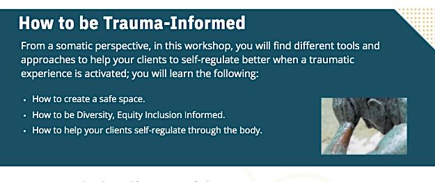 From a somatic perspective, in this workshop, you will find different tools and approaches to help your clients to self-regulate better when a traumatic experience is activated; you will learn the following: