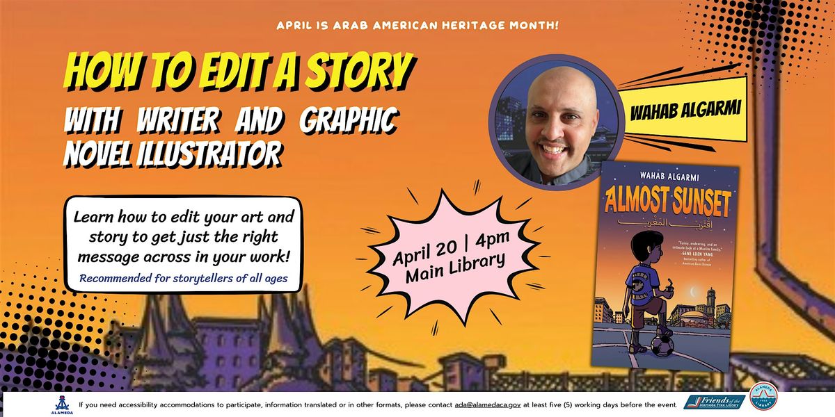 Find your story's sweet spot! On Monday, April 20 at 4:00 p.m. at the Main Library in Alameda, Mr. Algarmi will present two fun exercises that will guide storytellers as they learn to edit their art and writing so they're presenting the message they want their story to convey. This workshop is recommended for storytellers of all ages, as it builds off each person’s own abilities. So join Wahab for a fun activity as he challenges you to think a little differently and get out of your drawing and writing comfort zones!