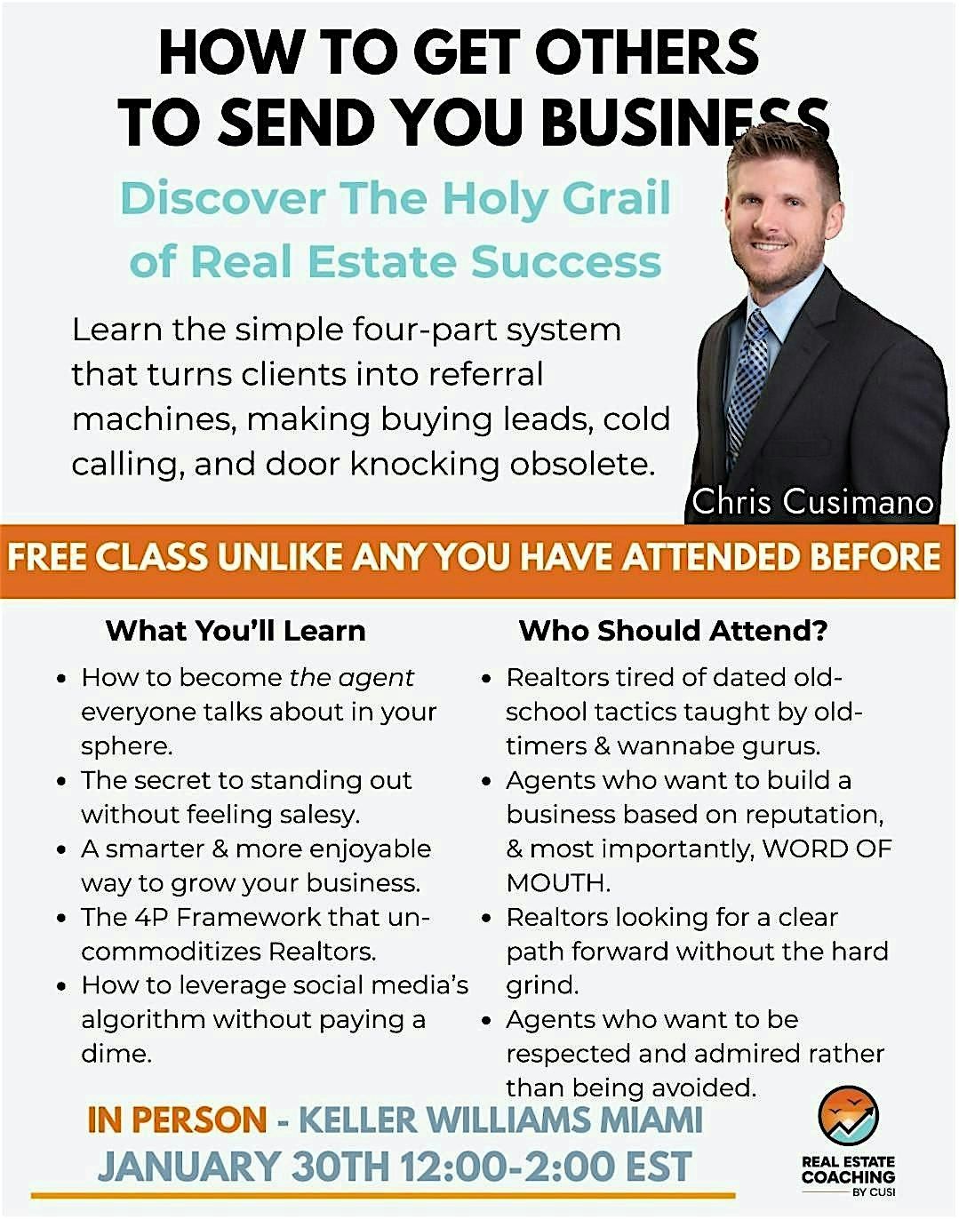Want a predictable, scalable business from referrals-from people calling YOU for a change? HOW do you make your phone ring? Come learn from the master-Chris Cusimano, who runs a BIG real estate business in Palm Beach, and can teach you how to do the same.