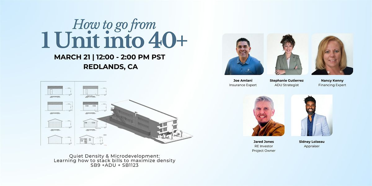 This event is designed for investors, developers, builders, and real estate professionals who want to understand how to responsibly scale density, unlock hidden value, and future-proof their portfolios using ADUs, SB9, and SB1123.
