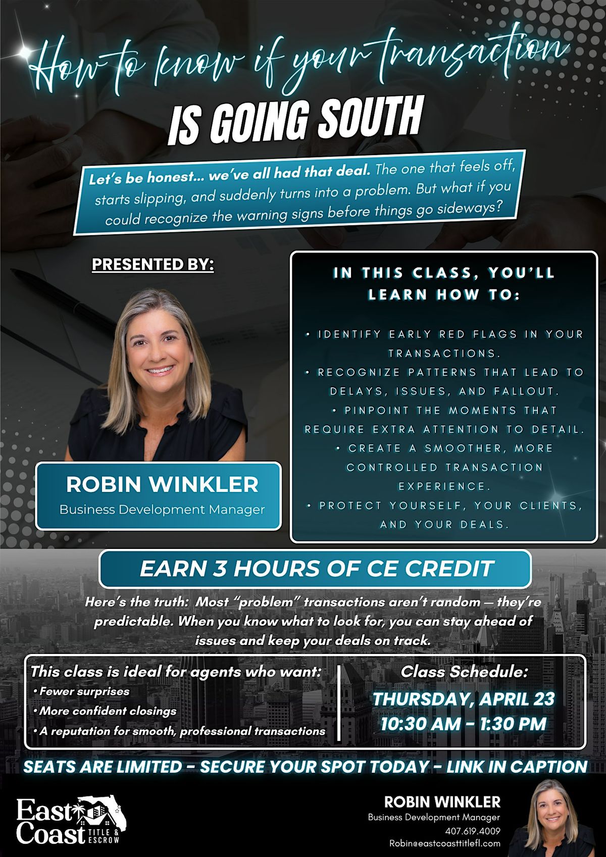 Join us for this CE credit class in New Smyrna Beach, FL and gain the tools to spot red flags early, prevent delays, and protect your deals. Led by Robin Winkler of East Coast Title & Escrow, this session is designed for real estate agents who want smoother, more successful closings.