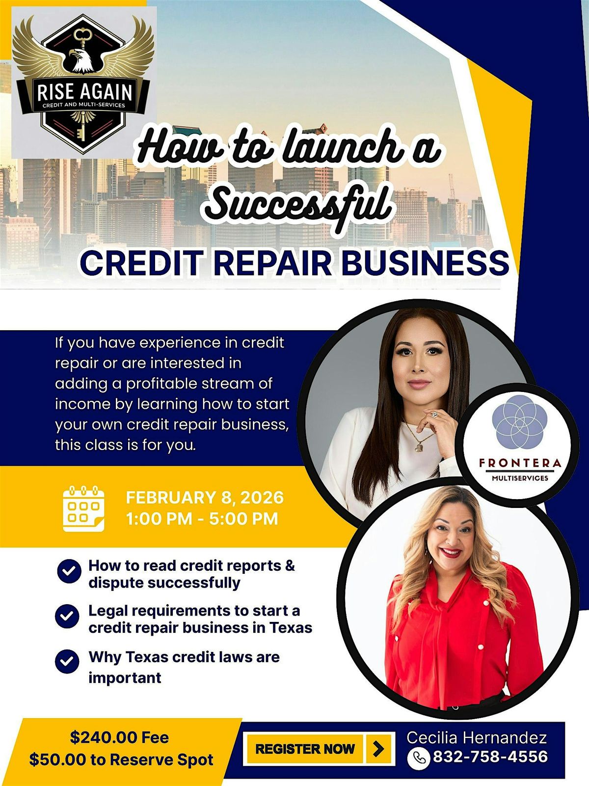 Ready to launch your credit repair business in Texas? Join Cecilia Hernandez, CEO of Rise Again Credit Solutions, and Frontera Multi-Services for a comprehensive training session! 📚 For $240, you'll learn how to navigate investment requirements, read credit reports, and dispute errors. Plus, discover how to generate business with minimal investment and create multiple income streams. As an added bonus Cecilia will share her knowledge of the credit laws in Texas as her extensive background working with civil law, debt defense & bankruptcy attorneys and why it’s so important to understand and educate your potential customers! Don't wait - register now and start rising to the top! Contact Cecilia @ 832-758-4556 to REGISTER with $50.00 ❗️ Spaces are limited ❗️
