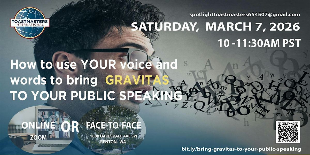 Join us in-person or on Zoom at Spotlight Toastmasters about Toastmasters and our theme of the day where our Toastmaster will share tips how to practice using your voice and words to bring gravitas to improve your speaking.