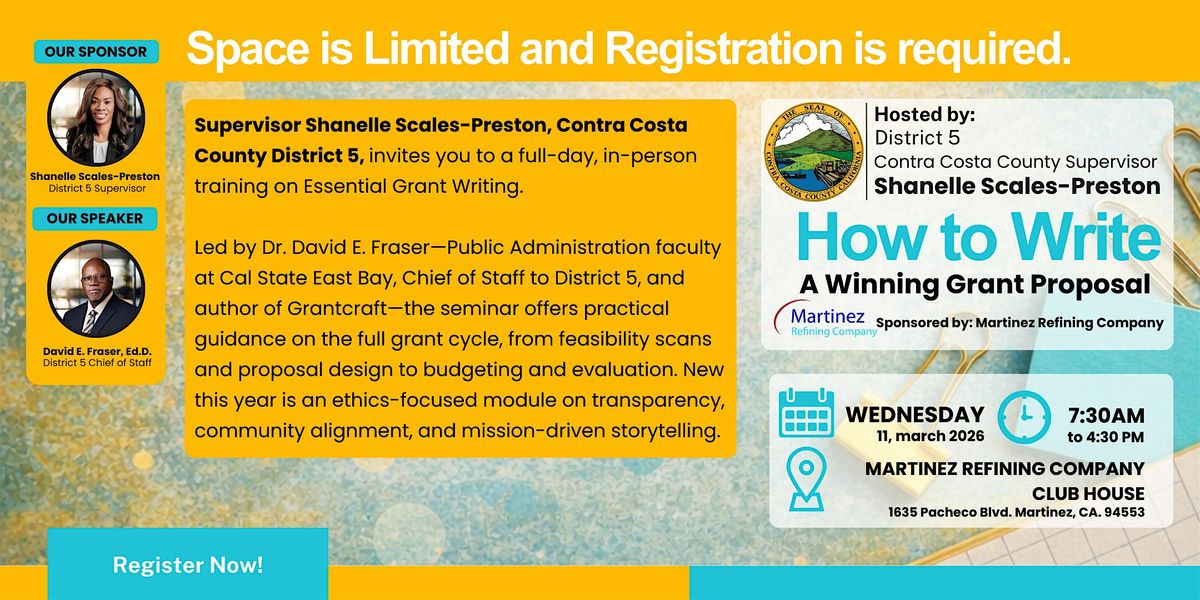 Supervisor Shanelle Scales-Preston, Contra Costa County District 5, invites you to join Dr. David E. Fraser—Public Administration faculty at Cal State East Bay and Chief of Staff to District 5—for an in-depth, hands-on exploration of the full grant cycle. Participants will learn how to move from concept to funder alignment, design persuasive proposals, build logic models, create strong budgets, and develop measurable evaluation plans.