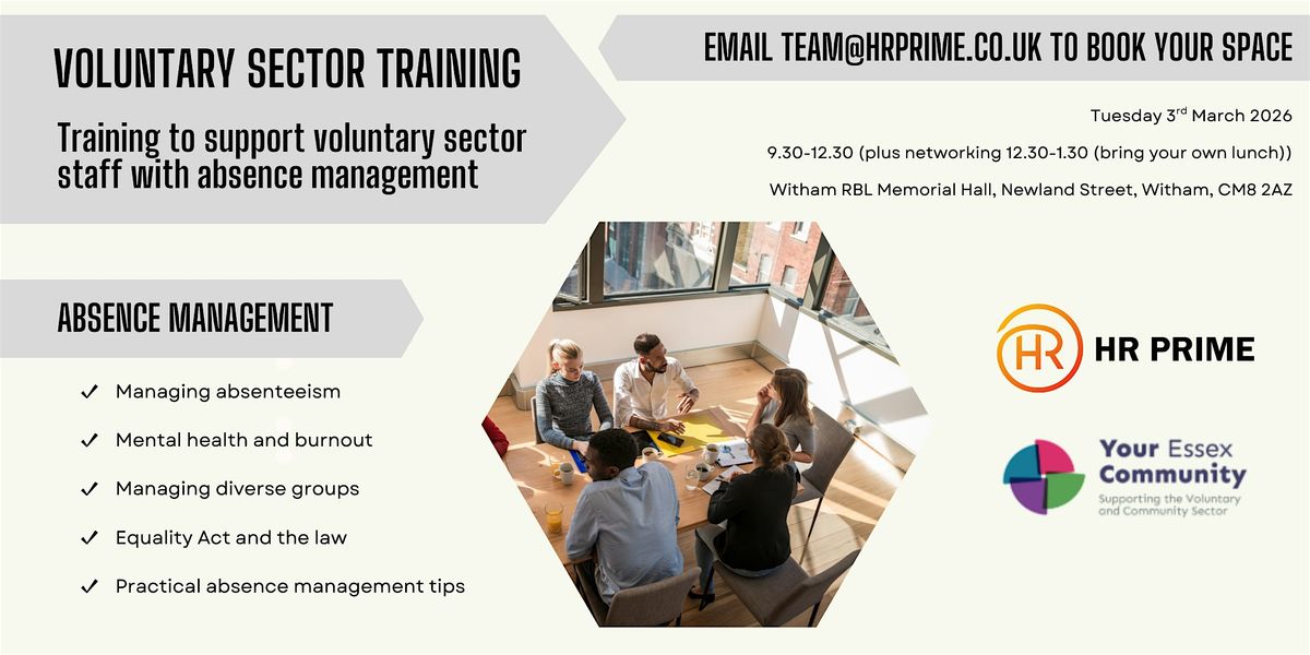 Welcome to the HR Primes Voluntary Sector Training - Absence Management event! Join us at Witham RBL Memorial Hall, Newland Street, Witham, CM8 2AZ on March 3rd, 2026 at 9:30 AM (Europe/London Time).