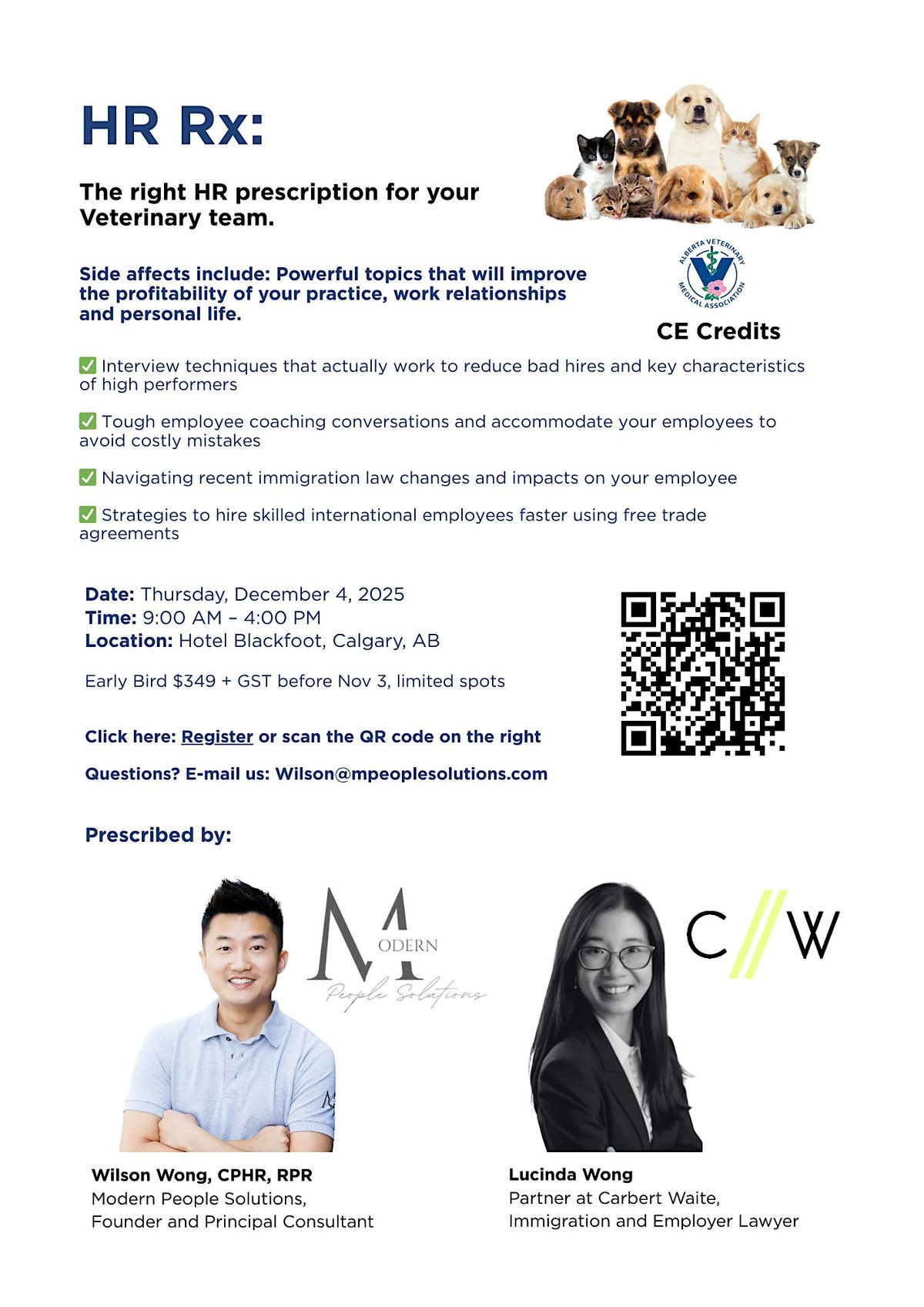 Wilson Wong is the Founder of Modern People Solutions. He's taught HR workshops that have been previously approved by the ABVMA, Alberta Dental Association and worked as an HR Instructor for the School of Business at SAIT. His company has worked with numerous industries, including a number of Veterinary clinics, Dental clinics and other types of healthcare buinesses (ex. acupuncture). He has spends time, hands on, inide of Veterinary clinics.