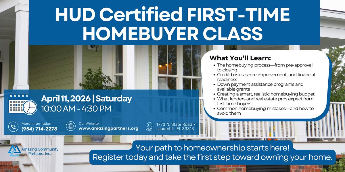 Join us for a HUD-Certified First-Time Homebuyer Class in Lauderhill, FL, presented by Amazing Community Partners, Inc. This free homebuyer education workshop is designed for individuals and families preparing to purchase their first home in Broward County and South Florida.