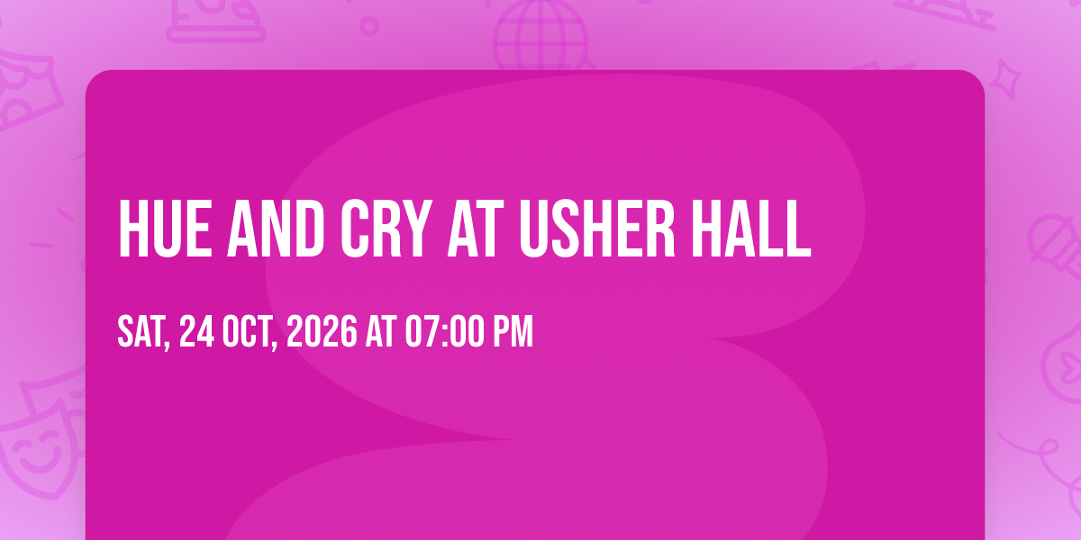 ✨ Enter a world of endless possibilities at Hue and Cry at Usher Hall, where every moment tells a story! 🏛️ The stunning Usher Hall in vibrant Edinburgh, SC transforms into a realm of wonder on October 24th, 2026 at 07:00 PM. 🌟 They have crafted an experience that goes beyond the ordinary, combining elements of surprise, delight, and pure entertainment. Every detail has been thoughtfully considered to ensure your journey with us is nothing short of extraordinary. 🎯 Join fellow adventure seekers and memory makers in this celebration of imagination and innovation. 🎊 Reserve your spot today and be part of something truly special!