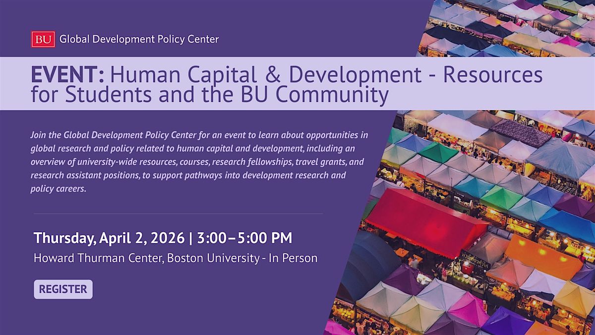 Across Boston University, students, faculty, and researchers are working on a variety of topics related to global development, from student-led work and academic programs to research centers and policy work. With the aim of bringing all those resources together, the Human Capital Initiative (HCI) at the Boston University Global Development Policy Center is hosting this outreach and networking event to help bring these conversations and opportunities into one shared space, and to present what resources are available to students and the BU community related to Human Capital and Development.