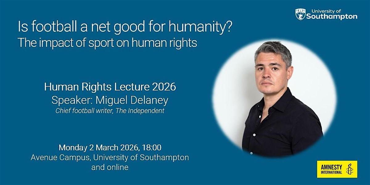 The School of Humanities at the University of Southampton, in partnership with Amnesty International (Southampton group), is excited to present Miguel Delaney, chief football writer for The Independent, to deliver the 11th Human Rights Lecture on Monday 2 March in person and online.