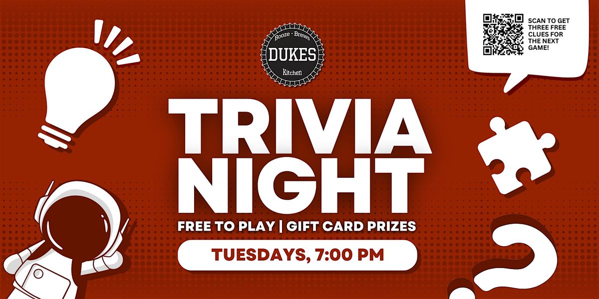 Join us for free live trivia every Tuesday at 7pm at Duke's in 6303 FM 1960, Humble, TX! Free to play, and top teams win gift card prizes!
