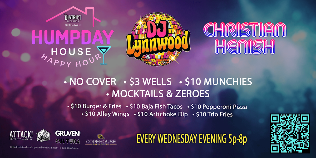 Humpday House Happy Hour isa weekly event held at The District Redlands in Redlands, California, starting on March 18, 2026. It is designed as a midweek "vibe" session featuring DJ sets and specific food and drink deals.