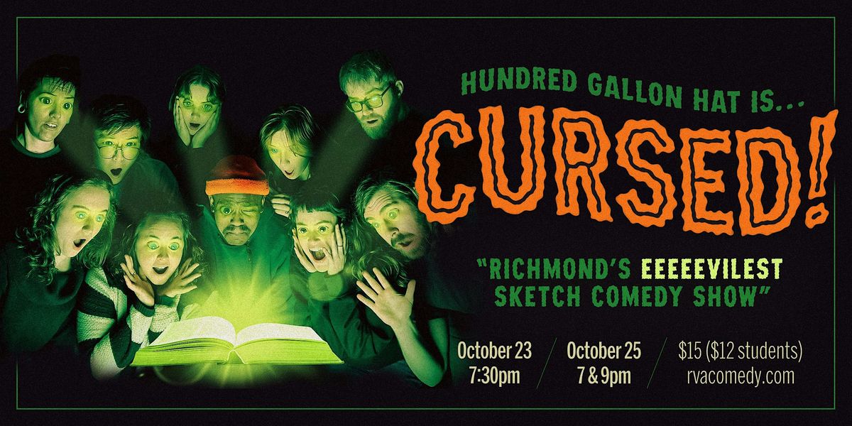 Horror of horrors! Hundred Gallon Hat is CURSED! Join us this spooky season as our intrepid comedians find themselves DOOMED by a faceless evil. Brace yourself for the terrors of evil pumpkins, Howie Mandel, and a horse named Susan. Will our cast break the curse in time to escape comedy god’s wrath!? Find out at Hundred Gallon Hat’s last show ever!