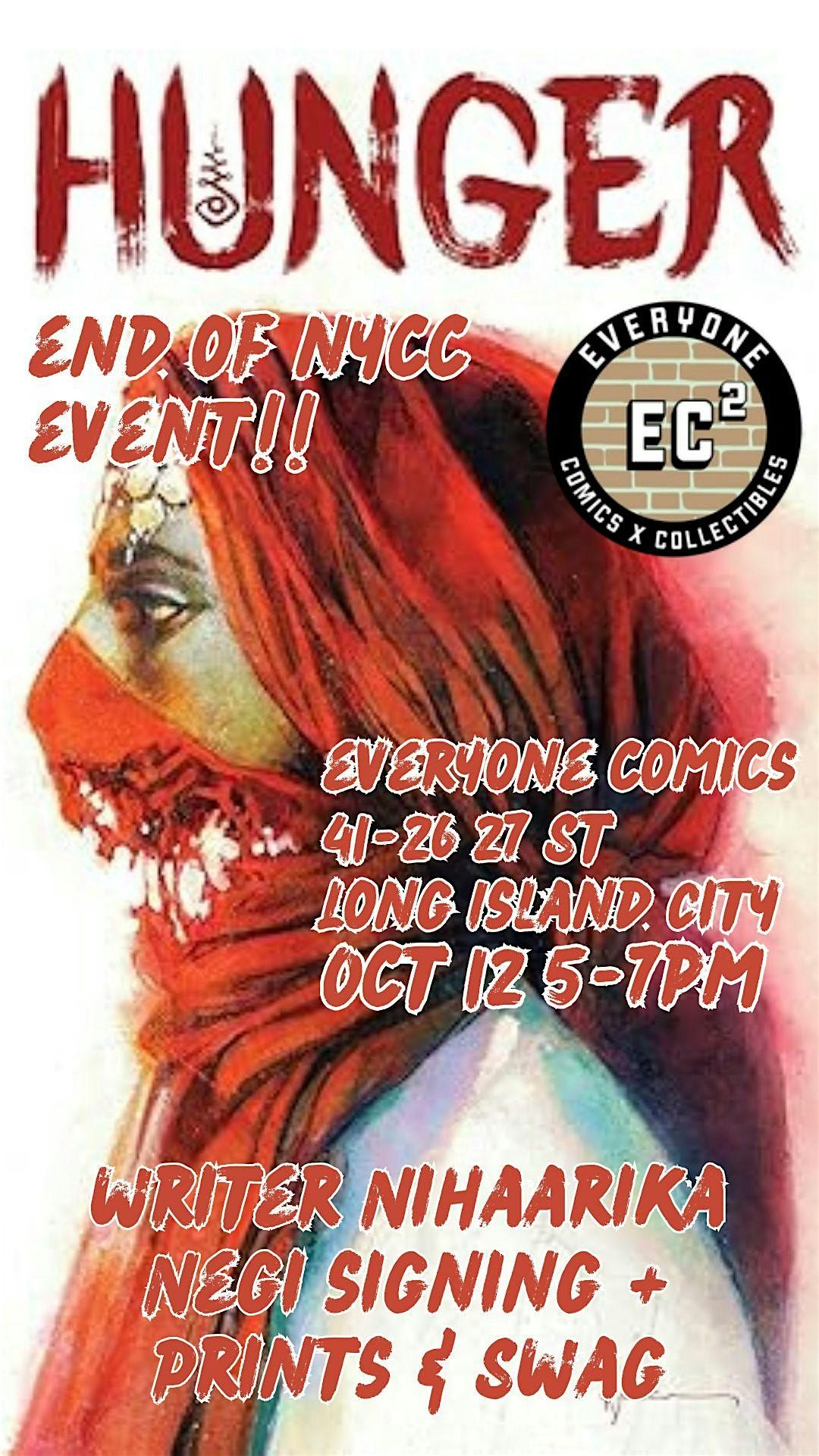 Writer and filmmaker Nihaarika Negi signing her new graphic novel Hunger--which has a beautiful cover by Bill Sienkienwicz!! Nihaarika will also have prints and swag!