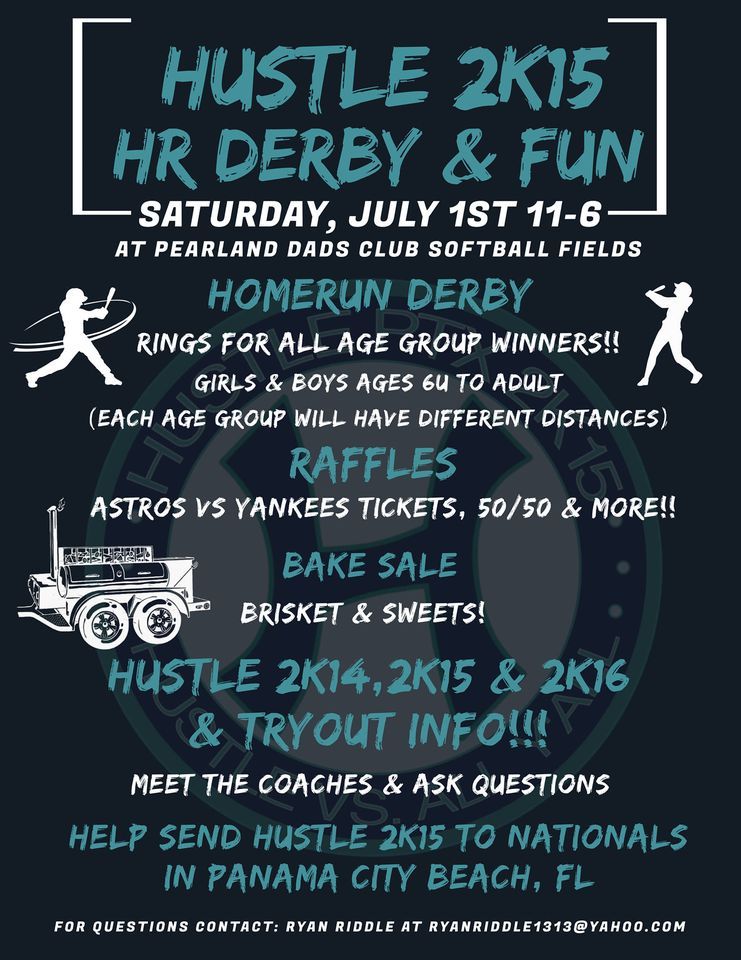 Bring the family to the Pearland Dads Club & have some fun in Hustle's Homerun Derby competition for all ages. There will also be some delicious Brisket, baked sweets, great raffles, & games!