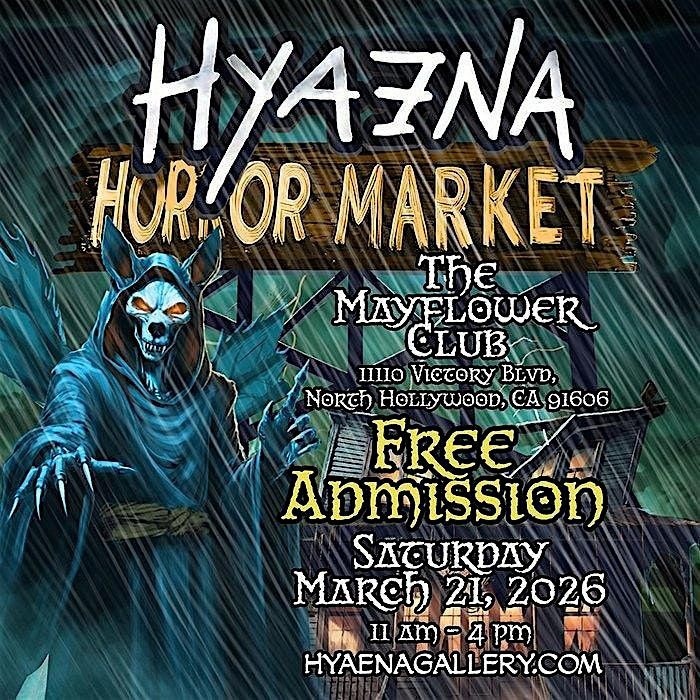 Hyaena returns for another awesome Horror Market at the Mayflower Club in North Hollywood, CA! This event is for everyone who appreciates bizarre, dark, and macabre art, vintage, oddities, gothic, occult, true crime, comic books, & everything rad…all in one unique space. See our list of guests who will be signing their work for an intimate meet and greet you won’t find anywhere else. This is the way horror cons used to be: no pretense, no nonsense, killer guests and vendors, and FREE admission.