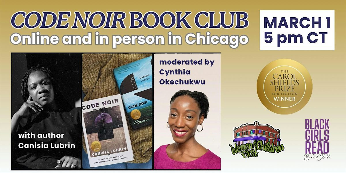 Join the Carol Shields Prize for Fiction, Black Girls Read Chicago, and Women and Children First for a Code Noir book club meeting! Author Canisia Lubrin will join online and the event will be moderated by Cynthia Okechukwu, who will be in person at Women and Children First at Chicago.