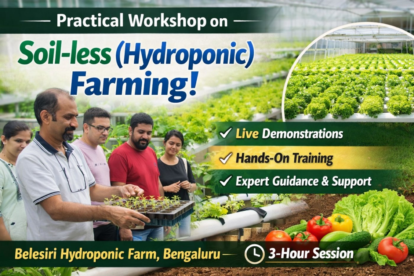 Join us for a 3-hour, hands-on learning experience at Belesiri Hydroponic Farm, Kodigehalli, Bengaluru, and discover how to grow your own vegetables using the Hydroponic (Soil-less) Farming method.