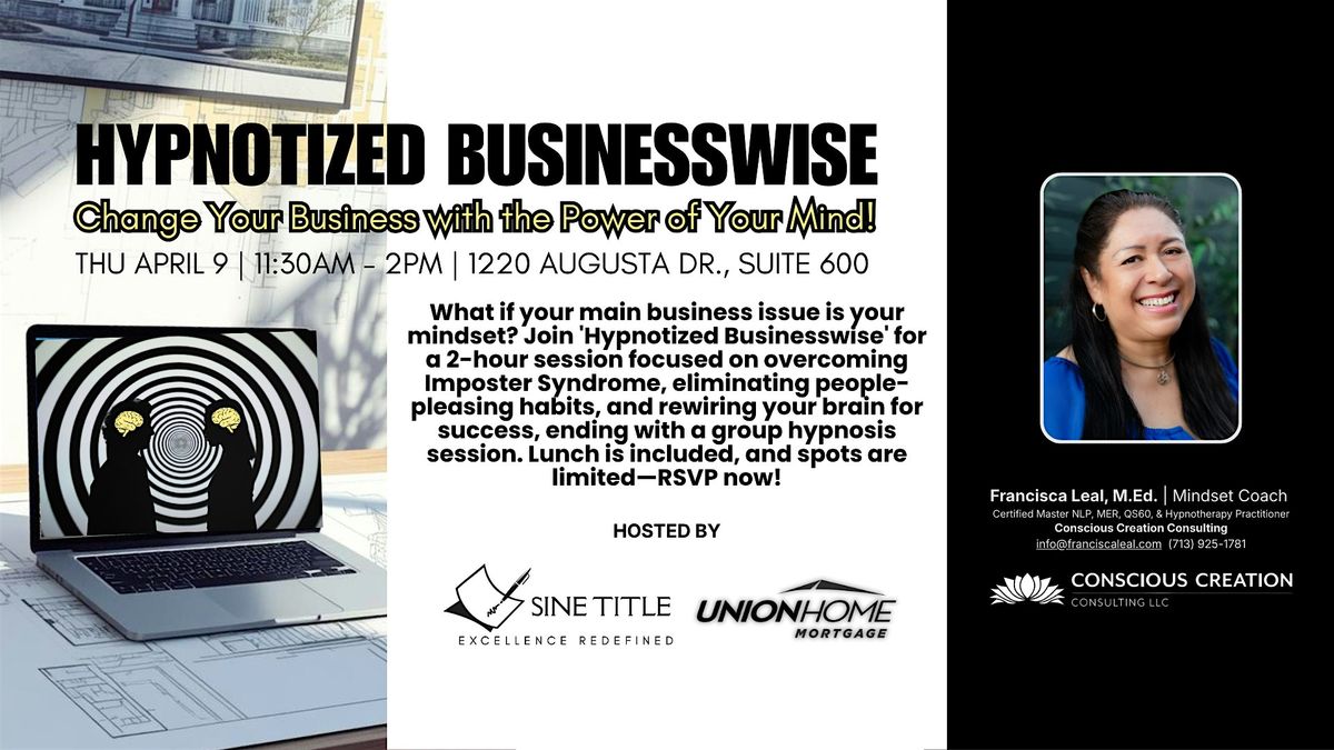 What if your main business issue is your mindset? Join 'Hypnotized Businesswise' for a 2-hour session focused on overcoming Imposter Syndrome, eliminating people-pleasing habits, and rewiring your brain for success, ending with a group hypnosis session. Lunch is included, and spots are limited—RSVP now!
