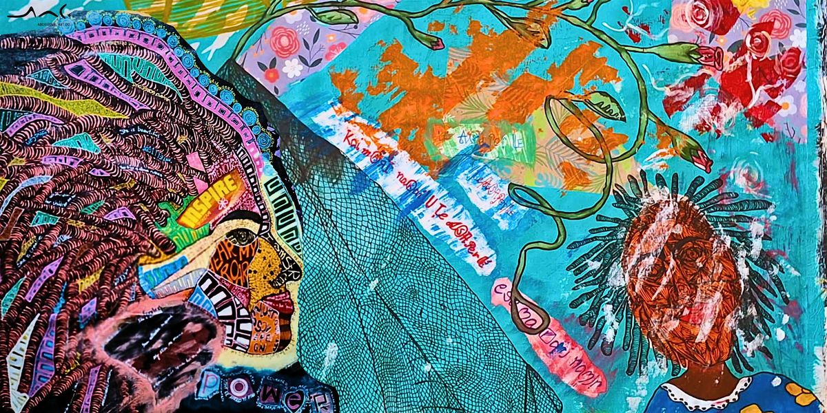 Working primarily with acrylic on canvas, Colina incorporates collage elements throughout selected pieces. Cotton materials adorned with First Nations designs symbolise the source of her strength, drawn from her maternal and paternal bloodlines as well as a deep spiritual connection she has encountered throughout different stages of her life.