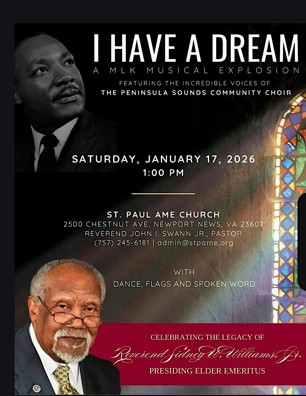 The Steward Board of St. Paul AME Church presents “I Have a Dream: A MLK Musical Explosion Honoring the Legacy of Rev. Sidney W. Williams, Jr.” as we celebrate the life and dream of Dr. Martin Luther King, Jr. and honor the remarkable service of Presiding Elder Emeritus Rev. Sidney W. Williams, Jr., who faithfully led St. Paul A.M.E. Church for over 33 years.
