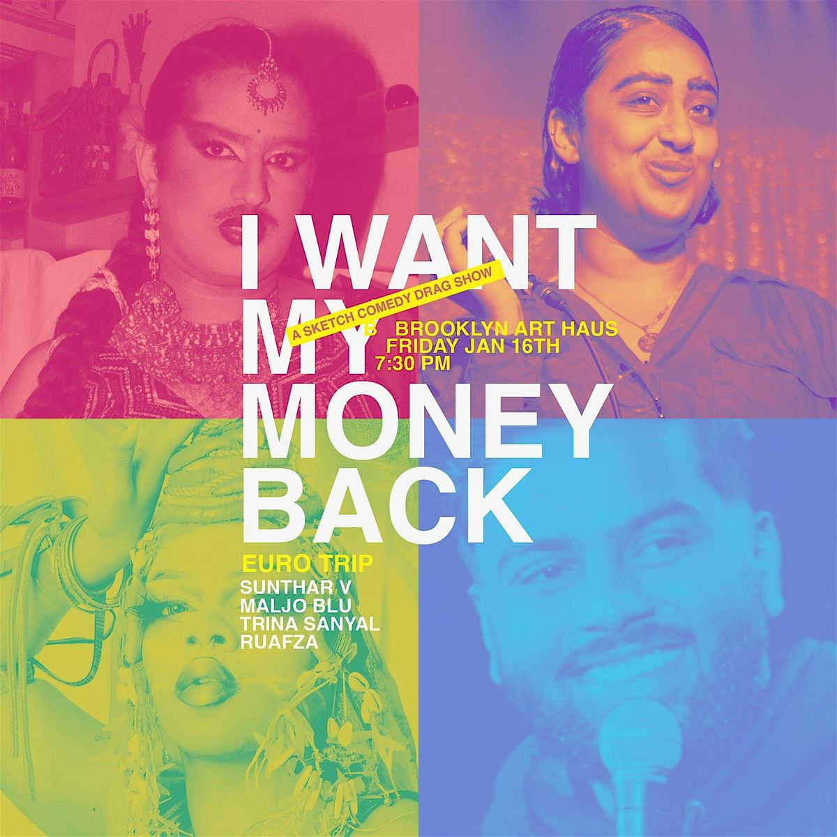 I WANT MY MONEY BACK: A Sketch Comedy Drag Show series, is a collaboration between artists Trina Sanyal and RuAfza. They bring their practices together to write a one hour show with renowned comedians and drag performers - each show following a subversive theme, featuring exclusively BIPOC trans and queer performers.