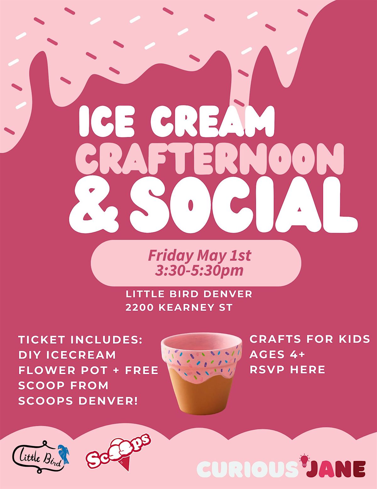 School's (almost) Out for Summer! Come paint a melty ice cream flower pot with Curious Jane at Little Bird Denver. Kids of all ages are welcome. Suggested age range is 4-12 years old. Each ticket comes with a free icecream scoop (includes sprinkles) from Scoops Denver across the street. Icecream voucher must be redeemed on 5/1.