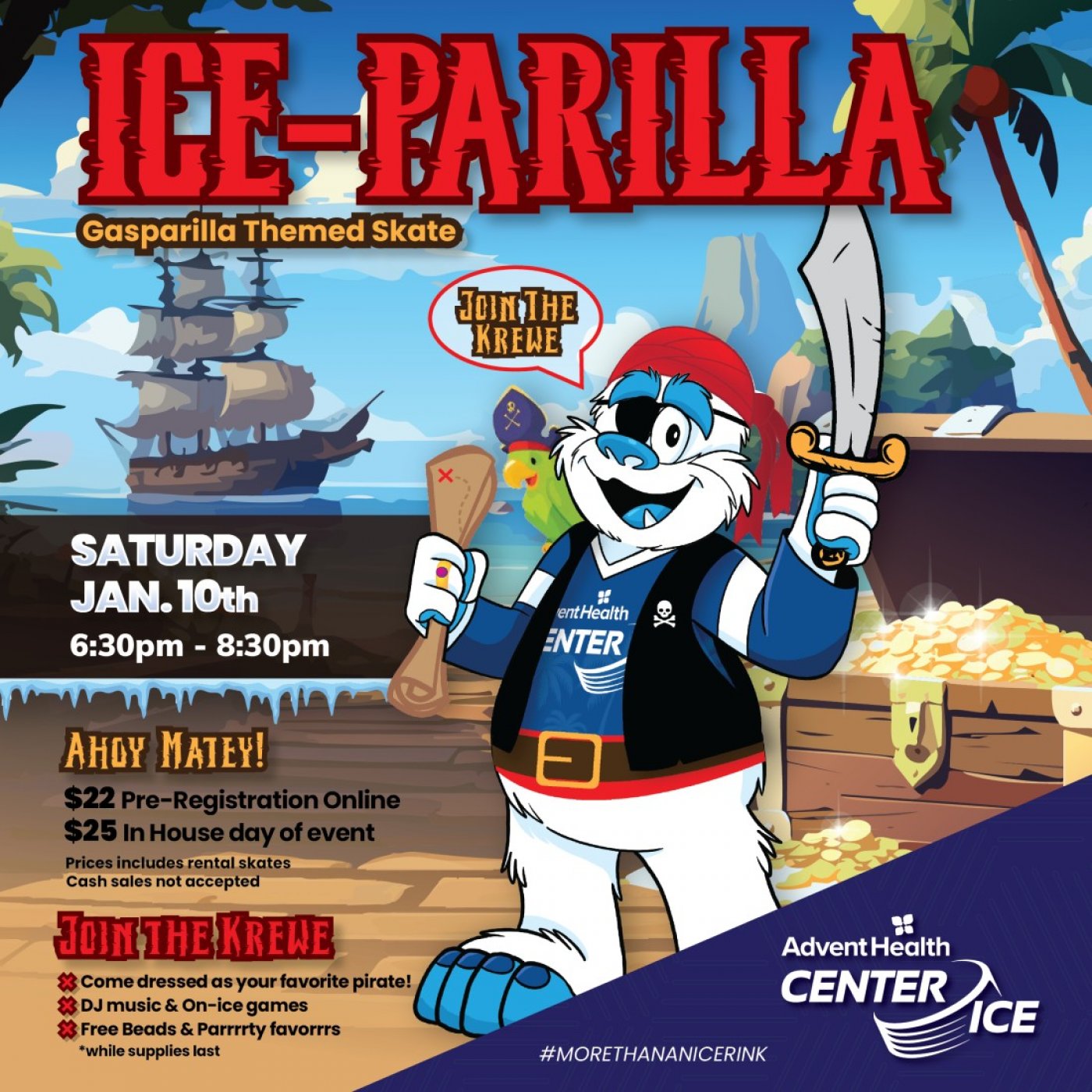 Get ready for a Gasparilla-inspired ice-skating event for all ages! AdventHealth Center Ice proudly presents “Ice-Parilla," a pirate-themed public skate session on Saturday, January 10, from 6:30 PM to 8:30 PM. This family-friendly ice skate will include pirate-themed paarrrrrrrrty favors, while supplies last. Come dressed up in your best pirate costume; eye patches, sashes, and billowing pirate shirts are encouraged. No fake or real weapons allowed. While skating on our Olympic-sized rink, guests will enjoy fun party lights, on-ice games, and a DJ playing all the pirate party hits.