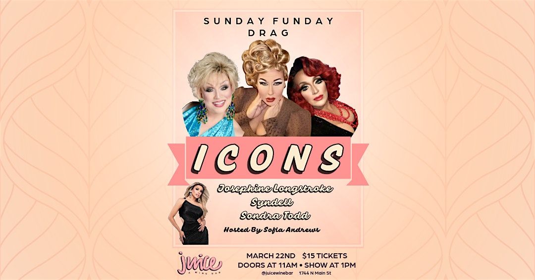 Juice Wine Bar is proud to announce the ICONS edition of their monthly Drag Show! A morning filled with delicious food, brunch wine cocktails, and spectacular drag performances from some of Jacksonville's most ICONIC drag stars. Our talented queens will entertain you as you sip on your favorite drinks and savor mouthwatering dishes.