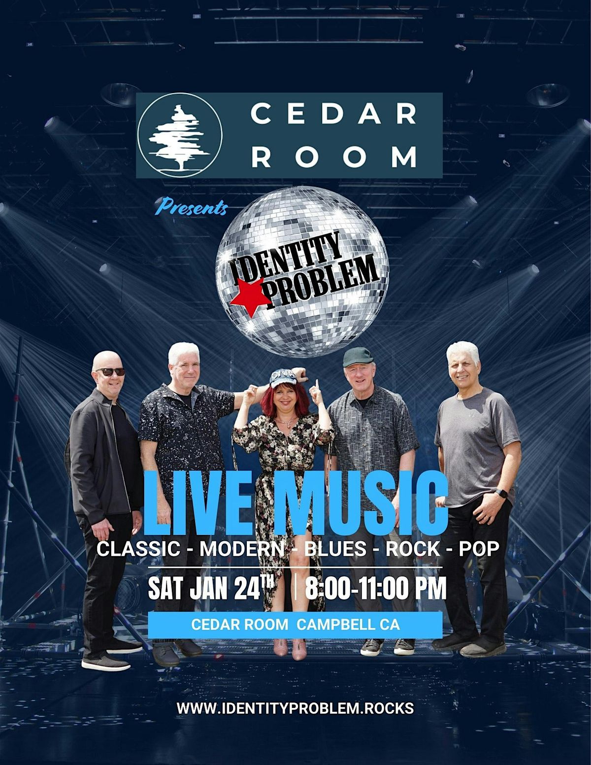 Get ready for a high-energy night of live music at The Cedar Room as Identity Problem takes the stage. This dynamic six-piece band delivers a crowd-pleasing mix of classic and modern hits, blending blues, rock, and pop into an irresistible live experience. Whether you’re looking to dance, sing along, or just enjoy great music with a drink in hand, this is a show you won’t want to miss.