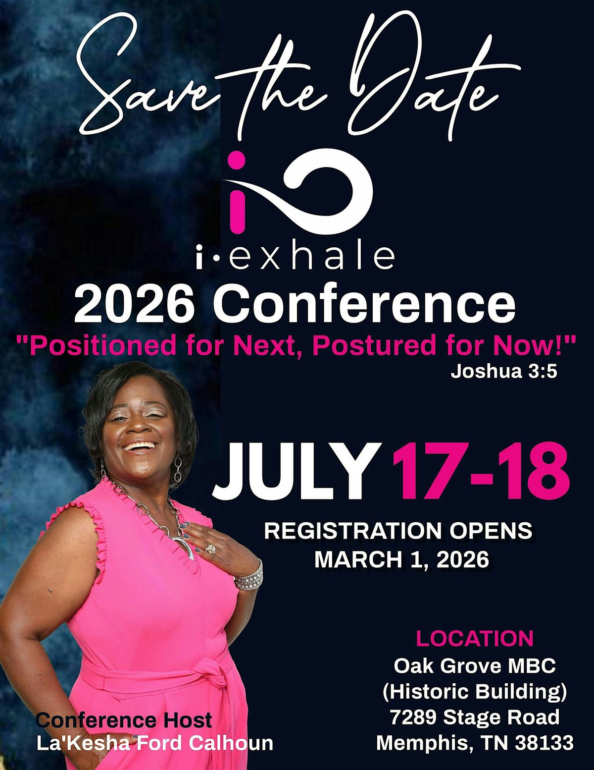 The 2026 i.exhale Women’s Conference theme is “Positioned for Next. Postured for Now.” based on Joshua 3:5. This experience is designed to help women consecrate themselves, heal from past hurts, and align for what God is doing NEXT,.