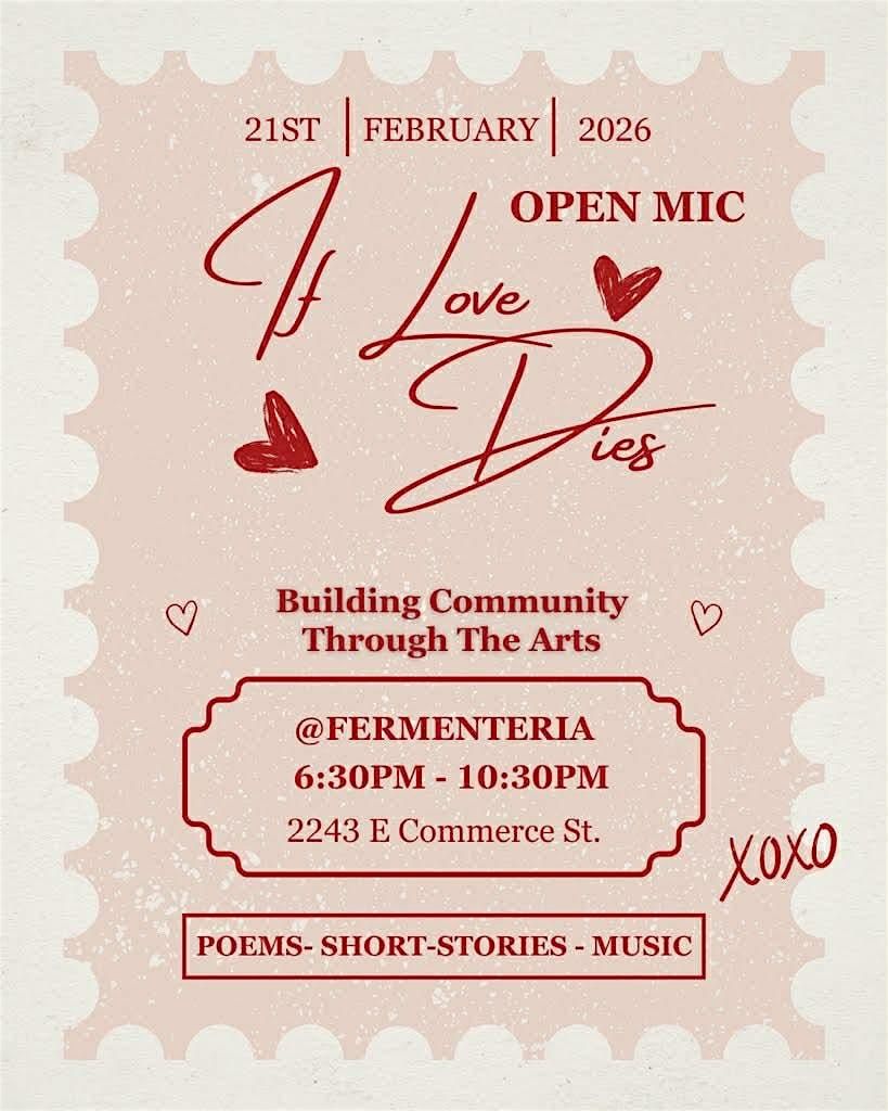 “If Love Dies” A Valentine-themed Open Mic Literary Night but don’t worry… love stories are welcome, not required.Poets. Short story writers. Singer-songwriters. All welcome!! Whether you’re bringing heartbreak, healing, satire, longing, rage, softness, or something beautifully unexpected We’re also merging this night with the event we had to cancel last month, so if you created work in January inspired by the live music from our amazing local musicians, this is your chance to finally share it. Let those pieces breathe.Romance or rebellion. Devotion or detachment.If love dies… what rises in its place?