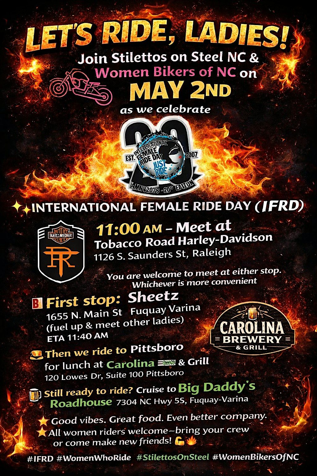 - Join us in person for a fun and empowering event celebrating the fierce women riders who rock those stilettos on steel! Whether you’re into bikes, style, or just looking to hang with some amazing ladies from North Carolina, this is the place to be. Don’t miss out on the energy, the stories, and the awesome vibes. Grab your gear and come ride with us!