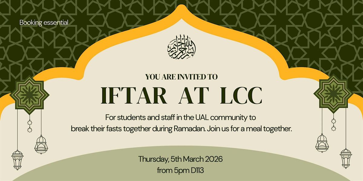 We are excited to host an Iftar event for the UAL/LCC Muslim Community, offering an opportunity for those who are fasting to come together and break their fast in unity. As we celebrate the blessed month of Ramadan, we invite you to join us for Iftar and share in the communal experience of breaking the fast at sunset.