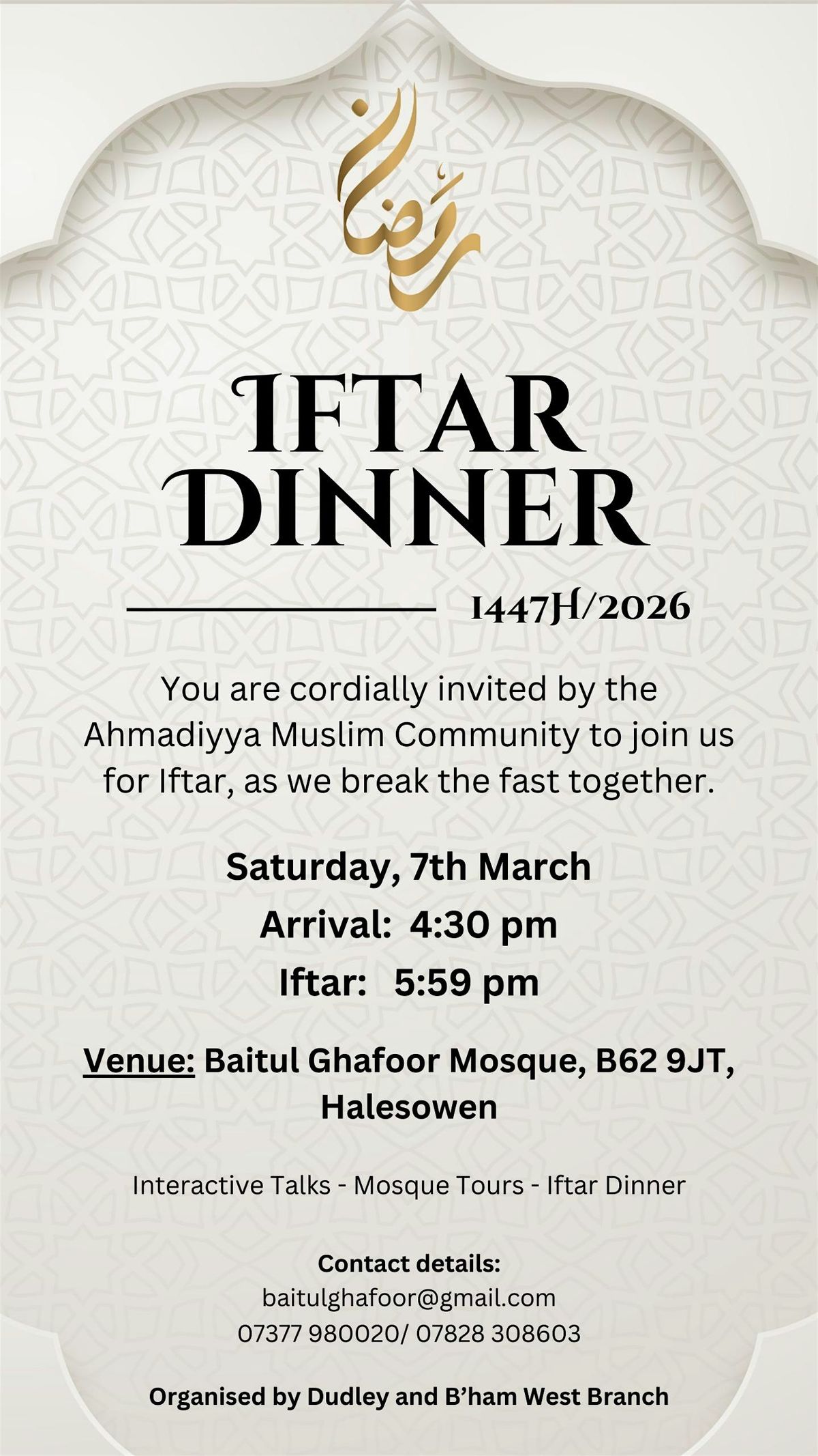 Iftar Dinner at the local mosque—join us for community, prayer & a warm meal as we break fast together. All are welcome!