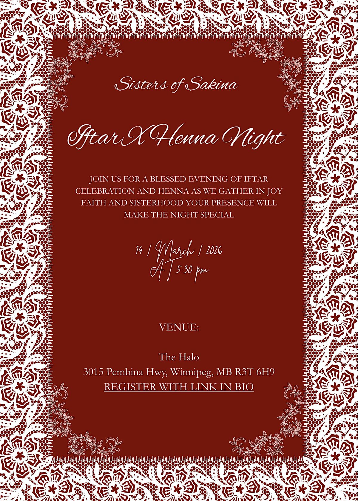 Get ready for a super fun evening filled with tasty Iftar vibes and beautiful henna designs. Whether you're here to chill, chat, or get inspired by the amazing henna art, this event's got you covered. Let's come together in person with some good vibes, and celebrate in style. Don't miss out on this awesome Iftar X Henna night experience!