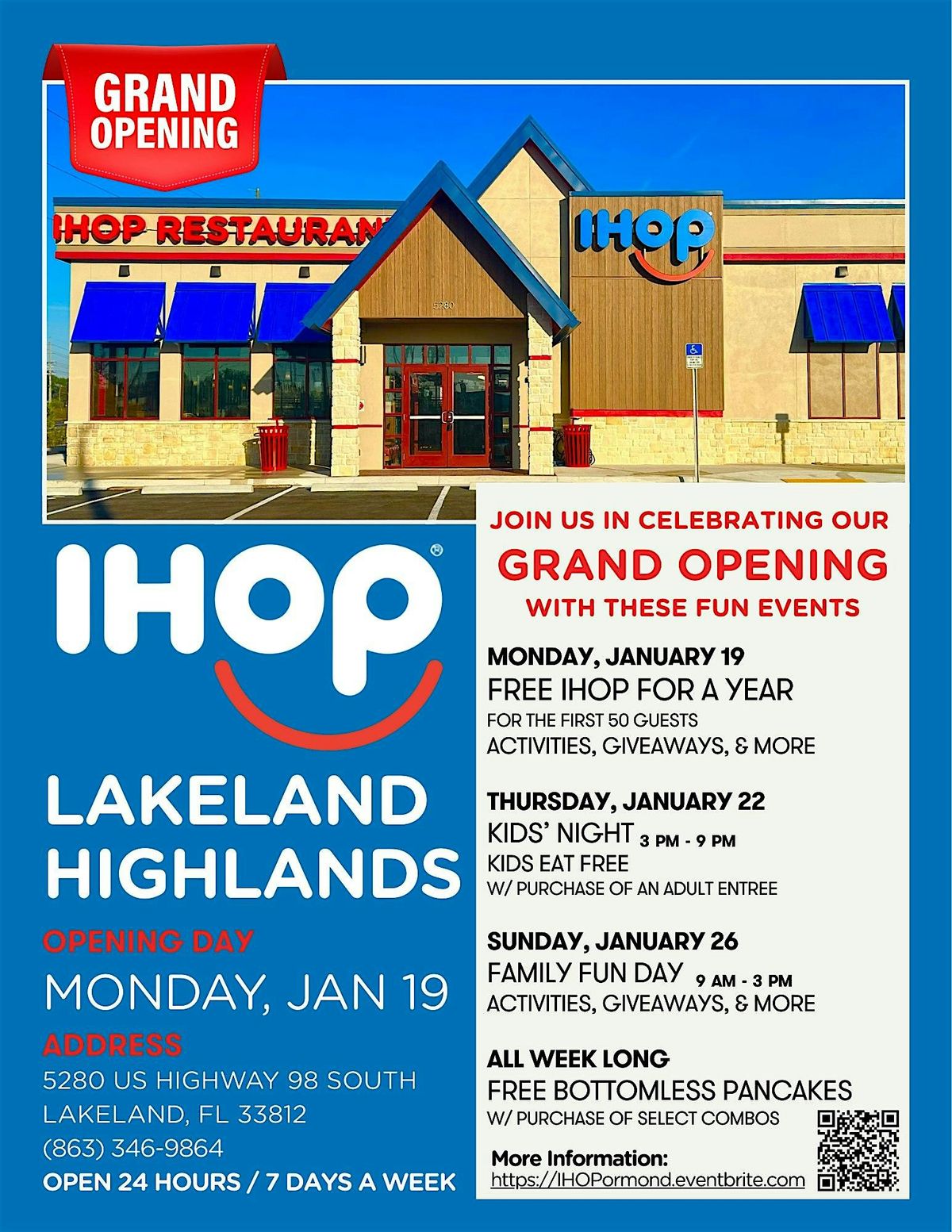 Join us in celebrating the Grand Opening of our new IHOP location in Lakeland Highlands with fun events all week & even some free food!