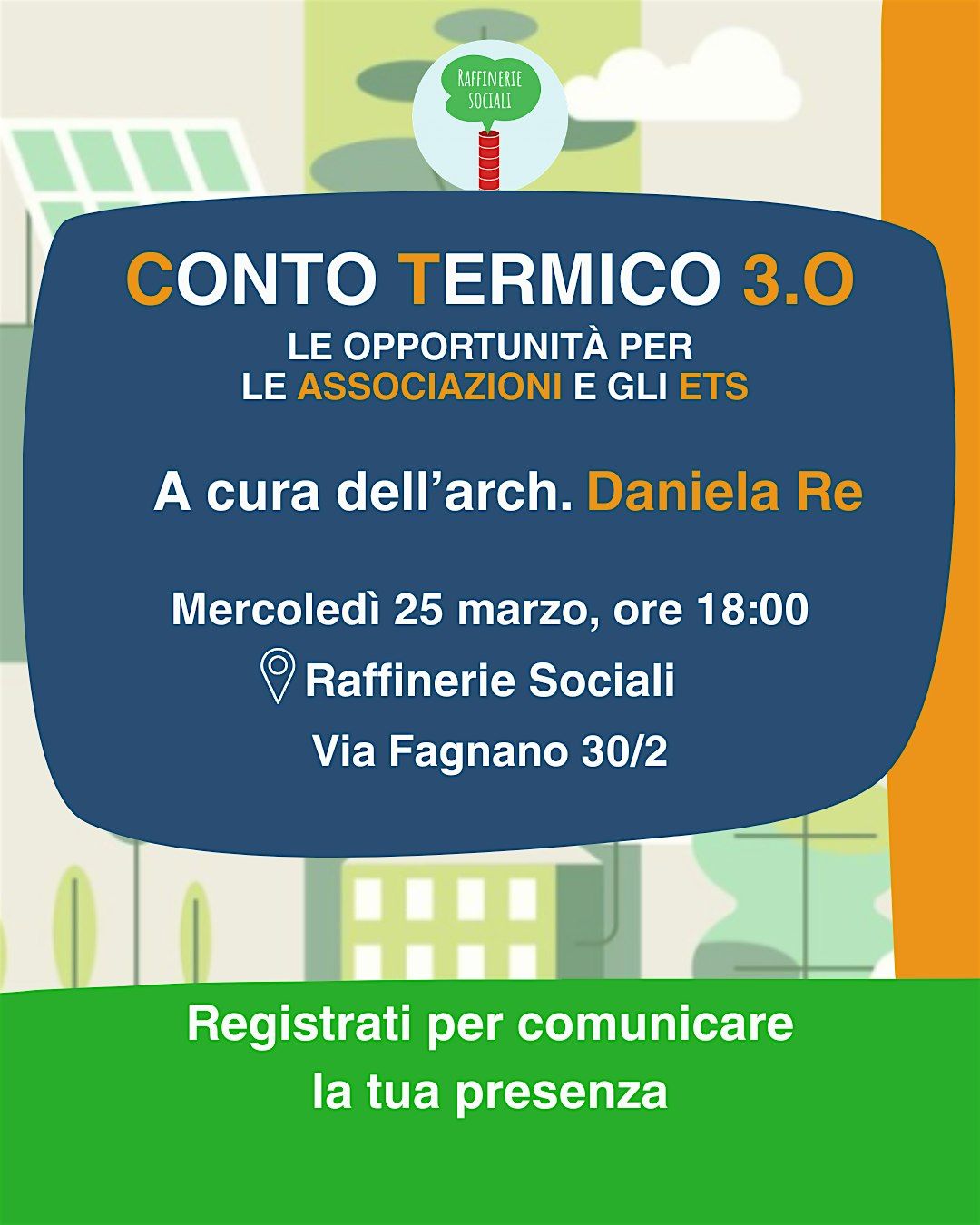 Le Raffinerie Sociali organizzano un incontro informativo gratuito dedicato alle associazioni e agli Enti del Terzo Settore interessati a comprendere come accedere ai contributi previsti dal Conto Termico 3.0, che si terrà mercoledì 25 marzo, in via Fagnano 30/2, alle ore 18:00.